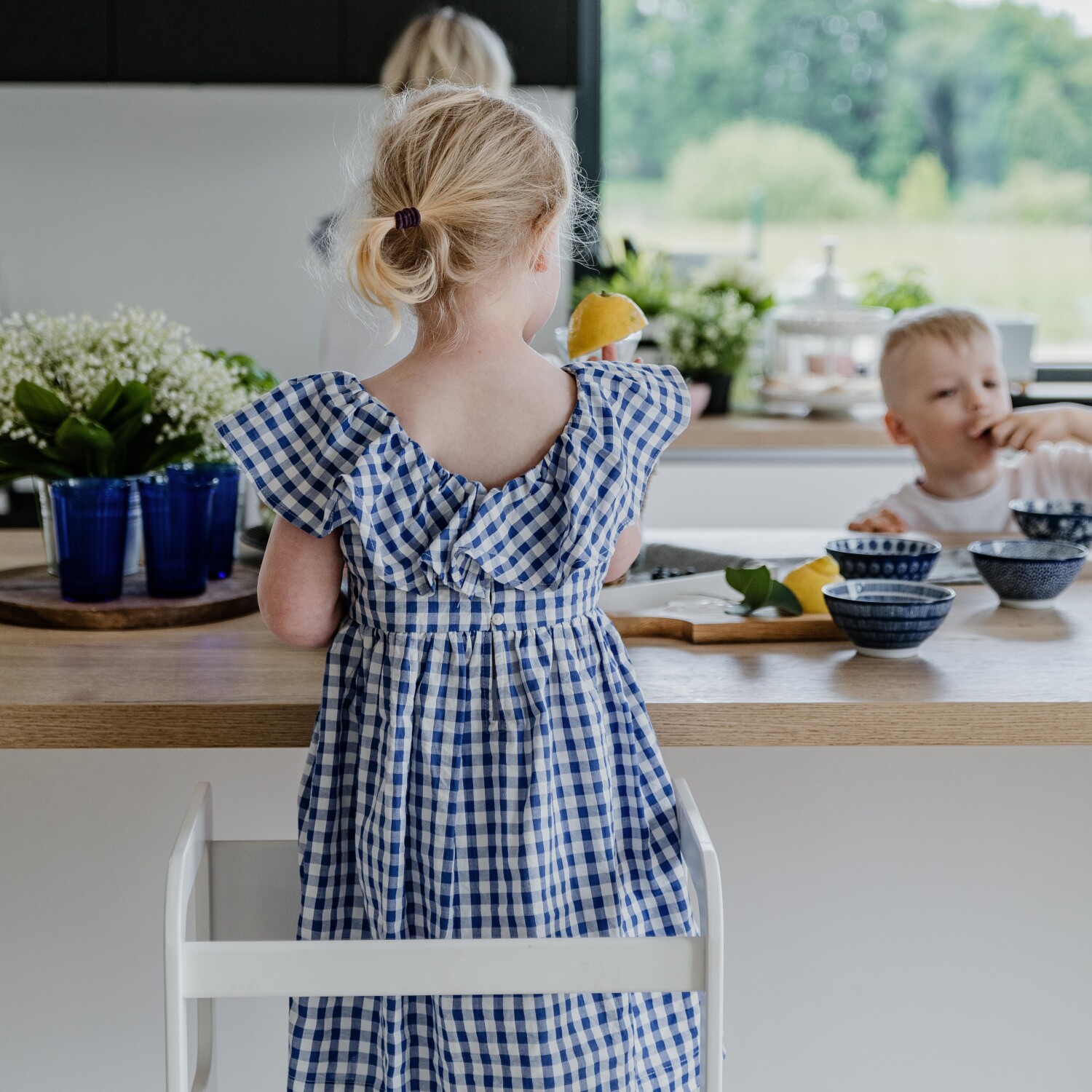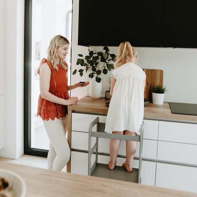 Votre enfant grimpe en toute sécurité grâce à la marche d’accès (24 cm) et se tient à hauteur de plan de travail sur la plateforme (45 cm du sol). Laver les légumes, mélanger la pâte, observer ce qui se passe dans la casserole… il participe vraiment.