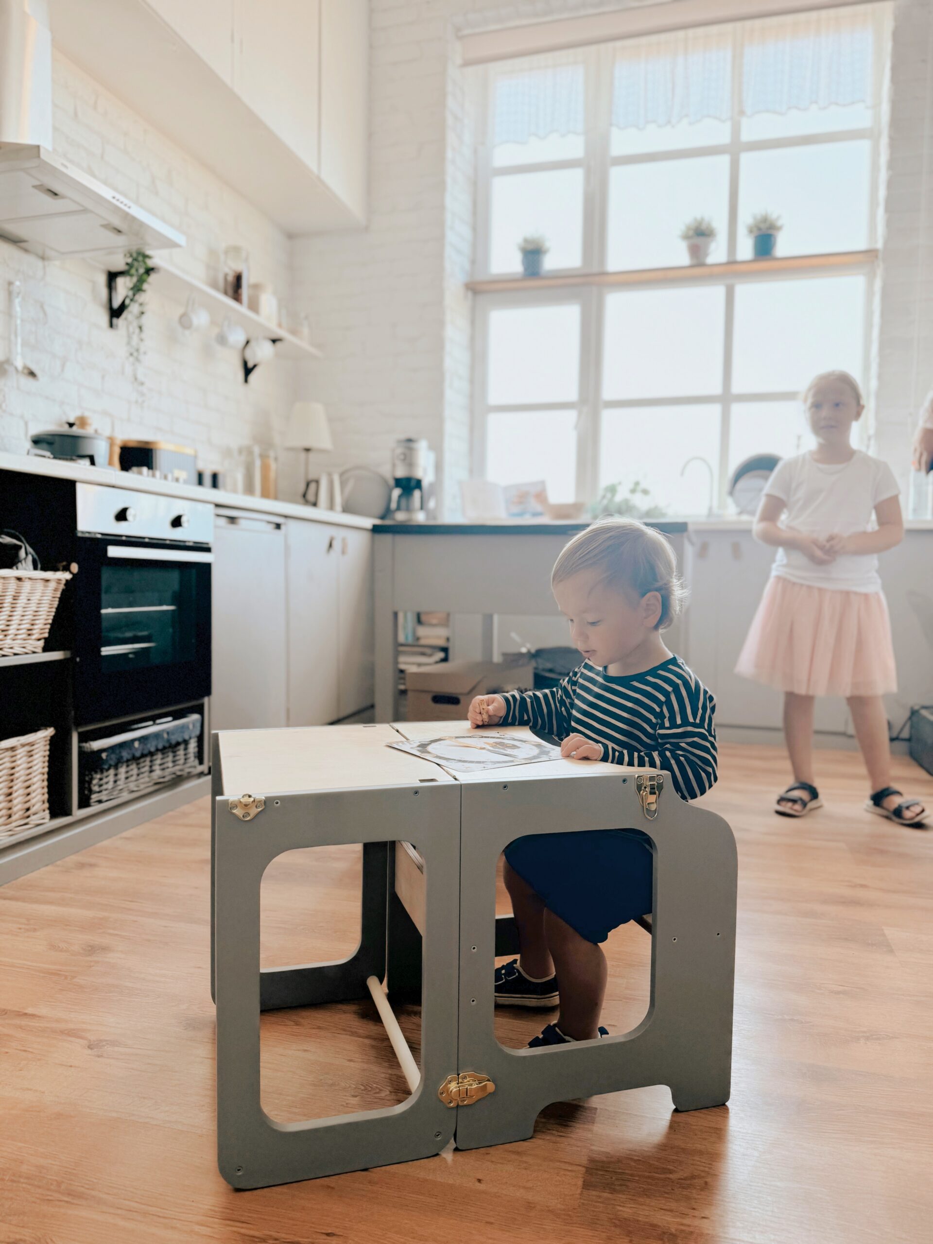 Mode bureau → Transformation rapide pour dessiner, grignoter, faire des activités. Son espace à lui, à la bonne hauteur.